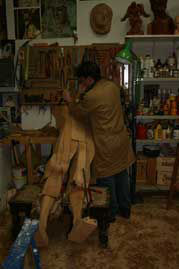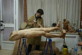 la sacadora de puntos esta manejada por un operario que aproximará lo más posible la forma del “embón” de madera al boceto. El escultor se ahorra así la tarea de desbaste. Tras sacar la figura de la máquina, ya en madera, se retalla, se raspina y se lija dejando la pieza definida por completo.